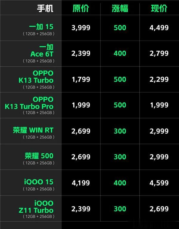 一加15加价500元、一加Ace6T加价400元、OPPO K13 Turbo加价500元、OPPO K13 Turbo Pro加价500元、荣耀WIN RT加价300元、荣耀500加价300元、iQOO15加价400元、iQOO Z11 Turbo加价300元。
